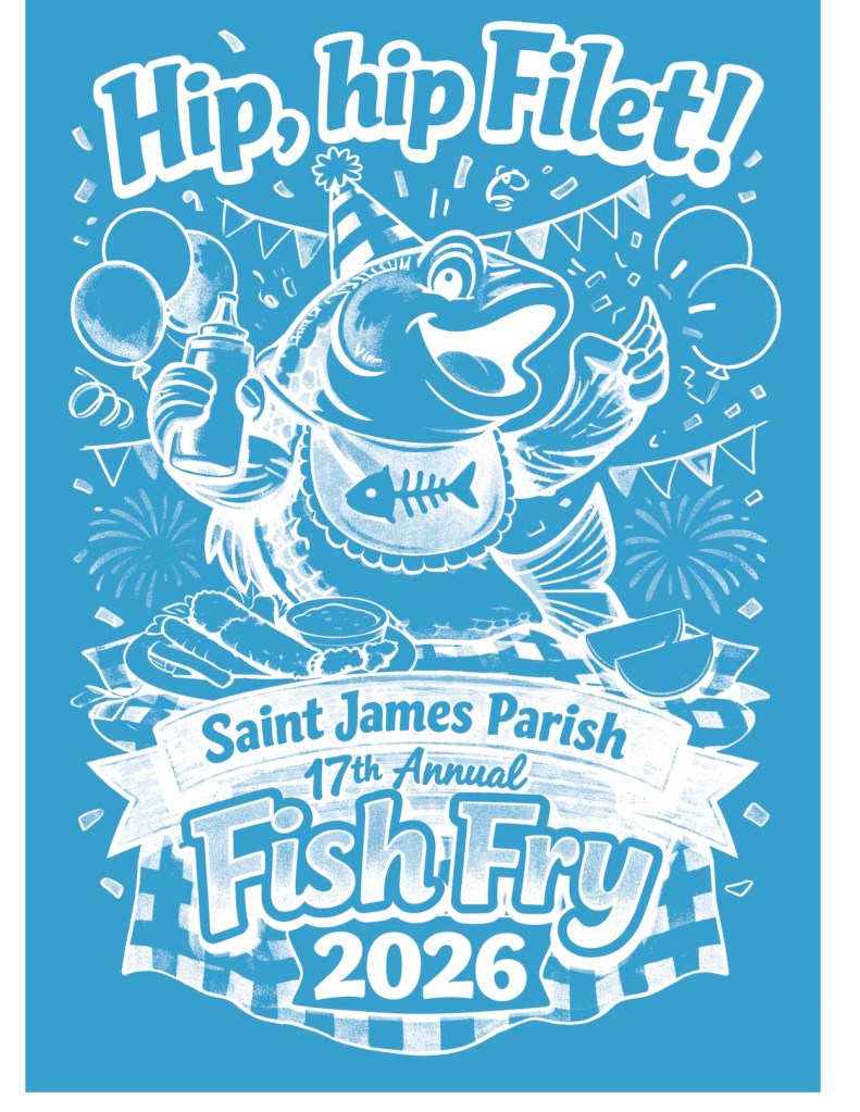 The Saint James Fish Fry began in 2010 and has been going and growing ever since. Snow, ice, a pandemic–can’t stop the Fry. We are a volunteer run, community fish fry. The donations we receive for the meals help fund the costs of the fry, meals to those who need assistance, and our social outreach programs which serve hundreds in our area.