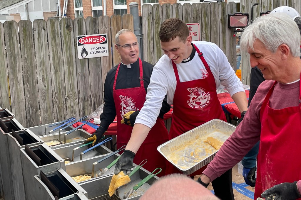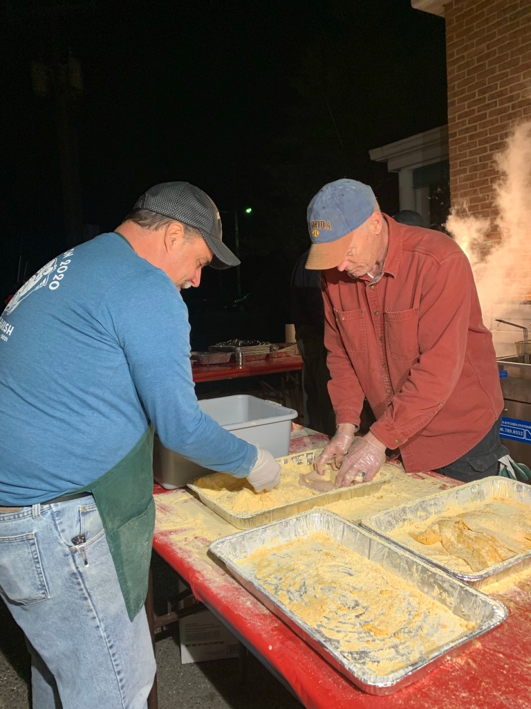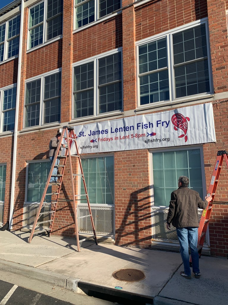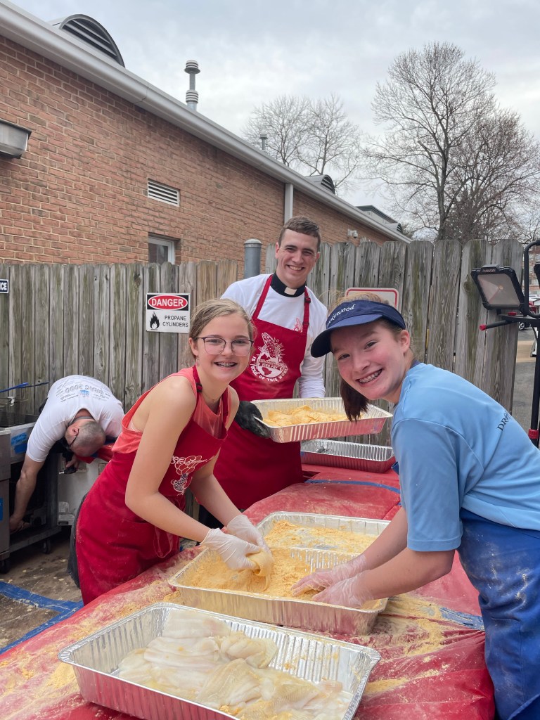 Our 14th annual Lenten Fish Fry has begun. We served over 1200 meals. Thank you to all of our volunteers–you made that possible! It was wonderful to welcome so many new folks and reconnect with others. There are so many different jobs of which we have highlighted a few in this gallery. If Fish Running and Fish Breading were Olympic sports–Saint James kids would win.